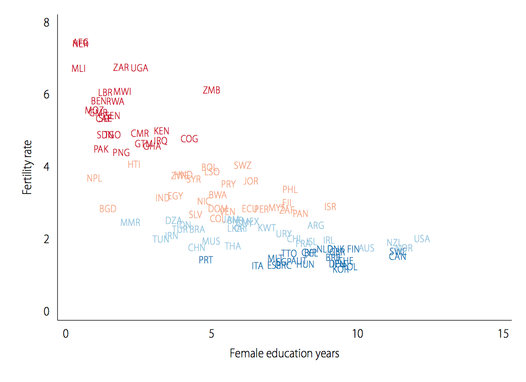 tw `plot' legend(off) yti(Fertility rate) xti(Female education years)